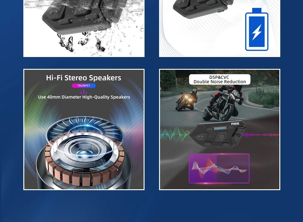 【Clear sound】: r6s motosiklet interkom, gelişmiş gürültü azaltma teknolojisine sahip bağımsız çift hoparlörlerle donatılmıştır, araç hızınız 100km/s'ye ulaşsa bile, arkadaşlarınızla iletişimi etkilemez